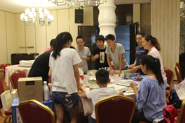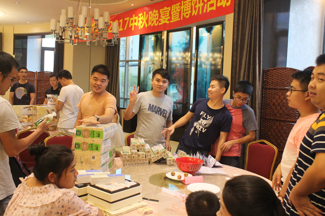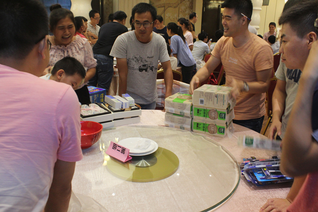 晚宴開始前,大手公司總經理馬總做了精彩的致辭 晚宴在一片歡快、幸福中度過。宴結束后,大家提著大包小包戰利品離開,彼此的臉上都期盼著對公司來年的更精彩的博餅活動。