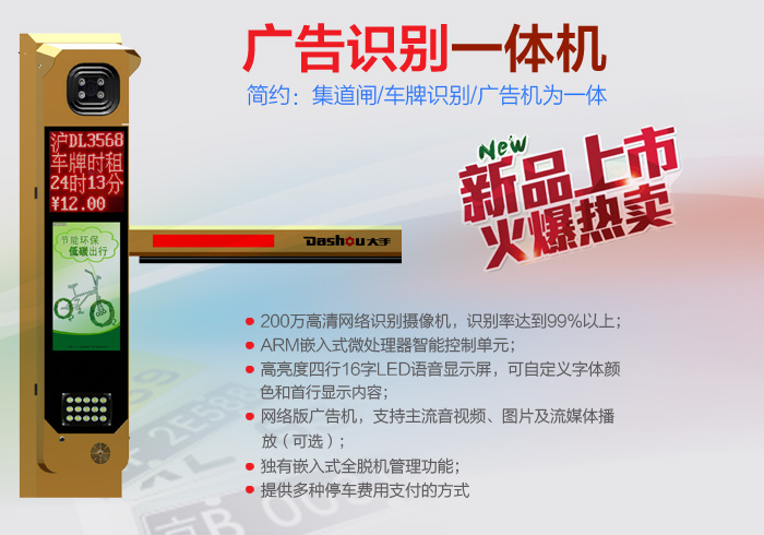 旗艦版廣告機(jī)型車牌識別收費(fèi)管理系統(tǒng),是大手控制目前最為高端的車牌識別收費(fèi)管理系統(tǒng),可實(shí)現(xiàn)時(shí)租收費(fèi)與月租管理,免取卡票不停車進(jìn)出停車場。系統(tǒng)以超高穩(wěn)定性取勝,采用全嵌入式系統(tǒng)構(gòu)架,可以免電腦全脫機(jī)工作。云端信息化上網(wǎng)功能,簡單聯(lián)網(wǎng)就能實(shí)現(xiàn)移動辦公和集團(tuán)管理,第三方信息化接口,可以將停車業(yè)務(wù)接入到第三方信息平臺和手機(jī)App系統(tǒng)里,輕松實(shí)現(xiàn)互通互聯(lián),適合用于鋪建城市停車信息化平臺和搭建各類以停車為基礎(chǔ)的互聯(lián)網(wǎng)電商平臺。可根據(jù)收費(fèi)需求,任意拓展出票或出卡停車收費(fèi)系統(tǒng)。